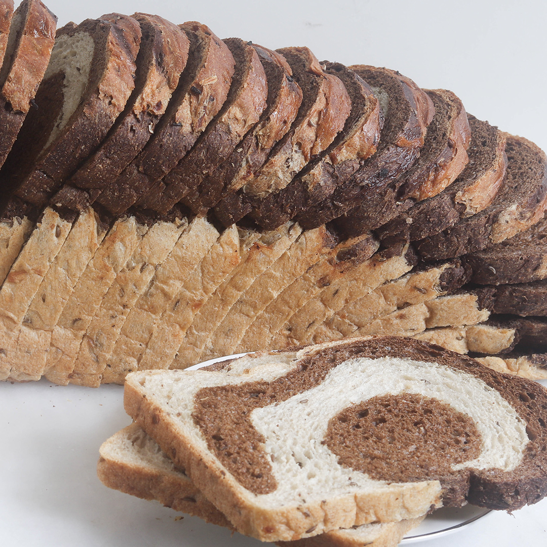 We sell large 2.5 lb loaves enough to make 13 sandwiches. Pumpernickel Light Rye Marble Rye Wheat White Multi-grain